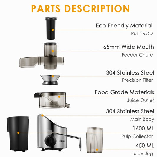 Juicer Machine, AICOOK Slow Masticating Extractor without Metal Filters, Easy to Clean, 3 Mode Adjustment Extrusion&Juice Pulp Controllable, Anti-Drip, Ice Cream&Recipes for Vegetables and Fruits