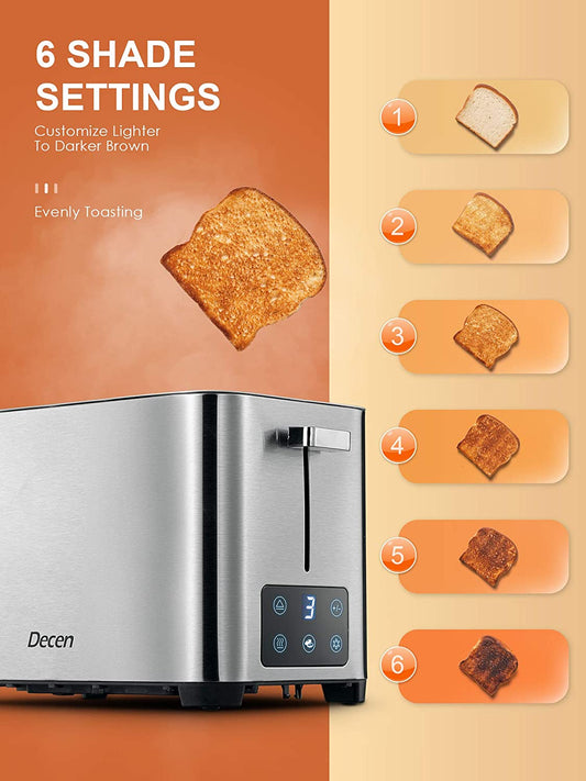 Toaster 2 Slice, DECEN Stainless Steel Toaster with Touch LCD Display (6 Toasting Settings), 2 Extra-Wide Slots, Bagel, Cancel, Defrost, and Reheat Function, Slide Out Crumb Tray, Silver