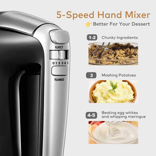 Decen Electric Beater with 3.5 Liter Bowl (360 ° Uniform Rotation), 5 Speed Plus Turbo Whisk with 2 Whisks and 2 Dough Hooks, Eject Function