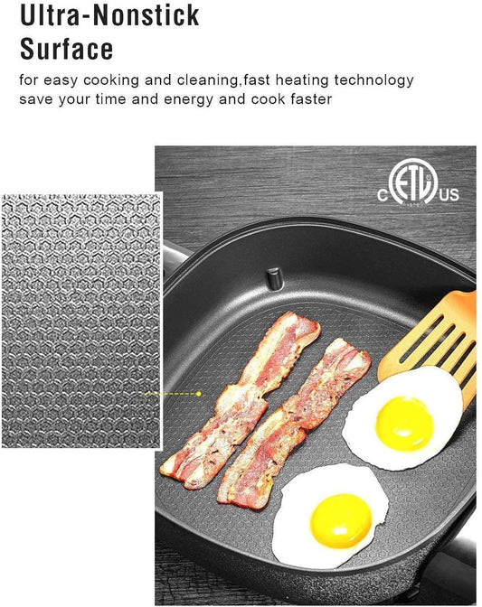 Decen Electric Skillet Non Stick Electric Frying Pan with Standing Tempered Glass Lid, Family Sized 6 Quart, 3 Inch depth, Heat Resistant Handles, 1360W, 12” x 12” x 3”