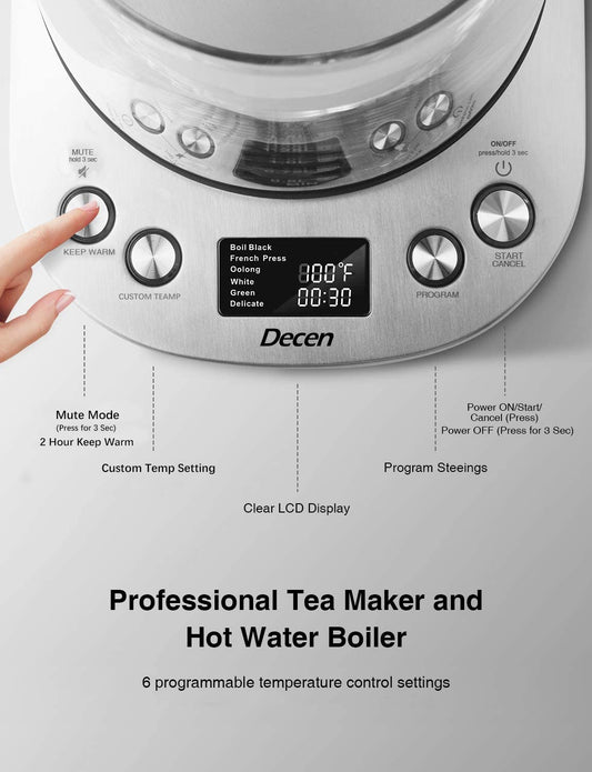 Decen Electric Tea Kettle, 1200W Variable Temperature Smart Tea Maker, Fast Boil Electric Glass Kettle with 2Hr Keep Warm Function, Premium Stainless Steel, Boil-Dry Protection, 1.7L