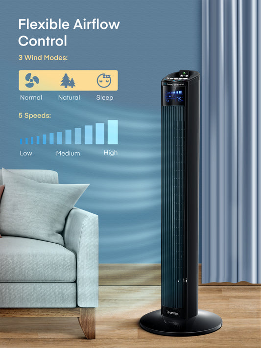 iTvanila Tower Fan, 36” Oscillating Portable Quiet Cooling Fan with Remote Control, 3 Modes and Speed Settings, 12-Hour Timer, LED Display Stand Up Floor Fans Safe for Bedroom, Home Office Use, Black