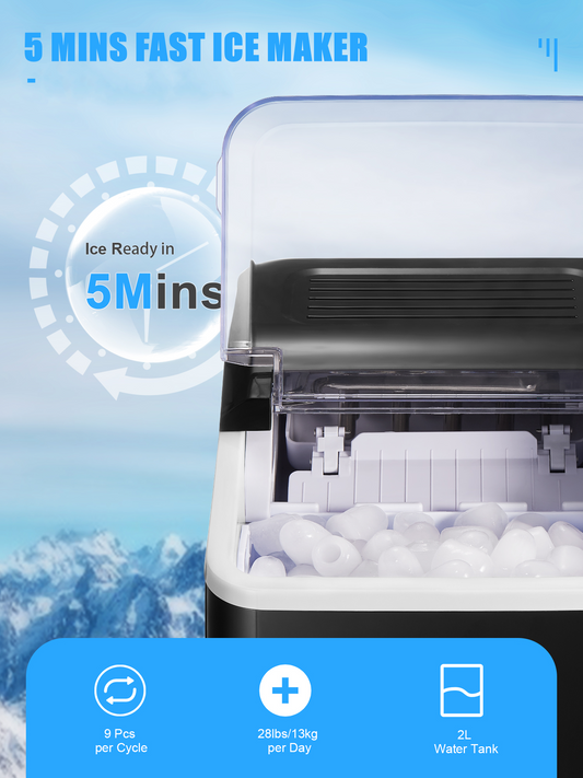 Ice Maker Countertop, 28 lbs. Ice in 24 Hrs, 9 Ice Cubes Ready in 5 Minutes, Portable Ice Maker Machine 2L with LED Display Perfect for Parties Mixed Drinks, Ice Scoop and Basket (Black)