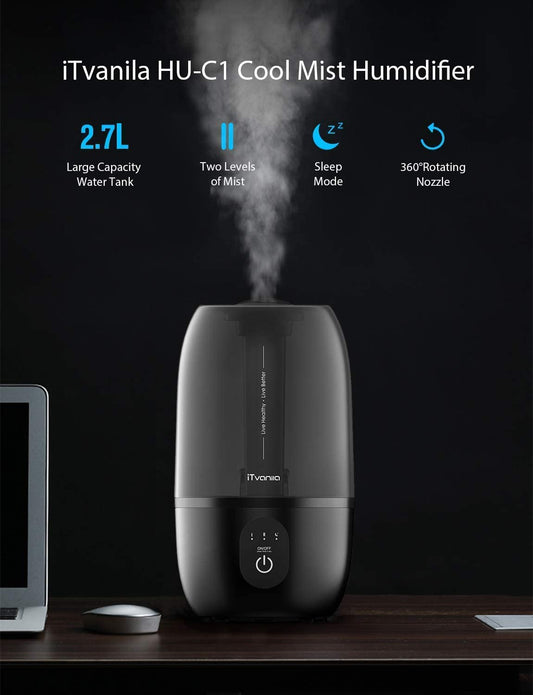 iTvanila Humidifiers, Cool Mist Humidifier for Bedroom, 2.7 L/0.7 Gal Baby Humidifier with Adjustable Output, Lasts to 30 Hours, Whisper-Quiet, Auto Off-black