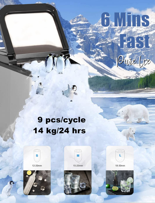 Ice Maker Machine Self Clean, 3 Size S/M/L, 13 KG / 28 lbs Ice in 24 Hrs, 9 Cubes in 6 Mins Ice Cube Maker, Timer, Ice Scoop, Basket & LED Display, for Home, RV, Kitchen, Office, Bar - Stainless Steel