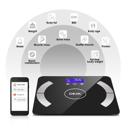 DEIK Smart Digital Body Fat Scale, Black Bluetooth Bathroom Scale, with iOS and Android APP, 180kg/400lb High Precision Measurement, Detects 13 Data including Body Weight, Fat Content, Muscle Mass