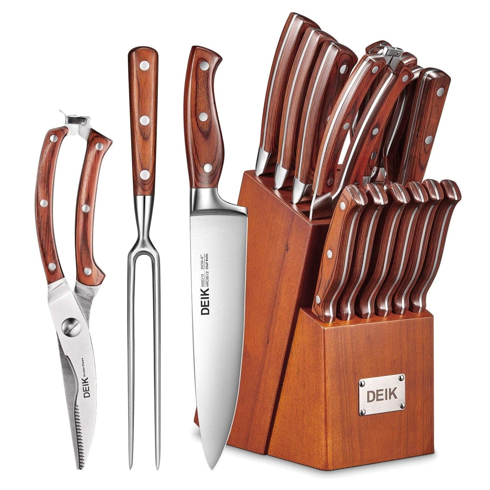 DEIK Knife Set, High Carbon Stainless Steel Kitchen Knife Set 16PCS, Super Sharp Cutlery Knife with Carving Fork and Serrated Steak Knives, Wood Knife Block