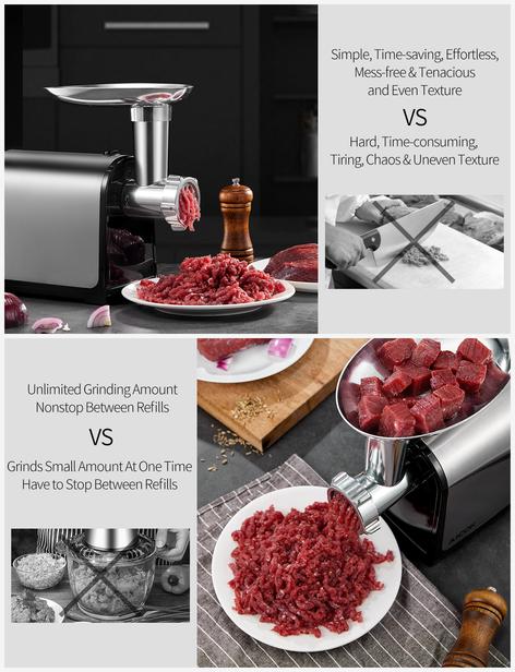 ★【Powerful & Fast Grinding】2021 Upgrade Version - Advanced copper motor with power up to 300W ( 2000W Max ) lock power. Much more convenient and efficient than chopping by hand, 3 pounds of minced meat can be produced per minute. This meat grinder is ideal for ground meat and stuffing making, fast and conveniently.