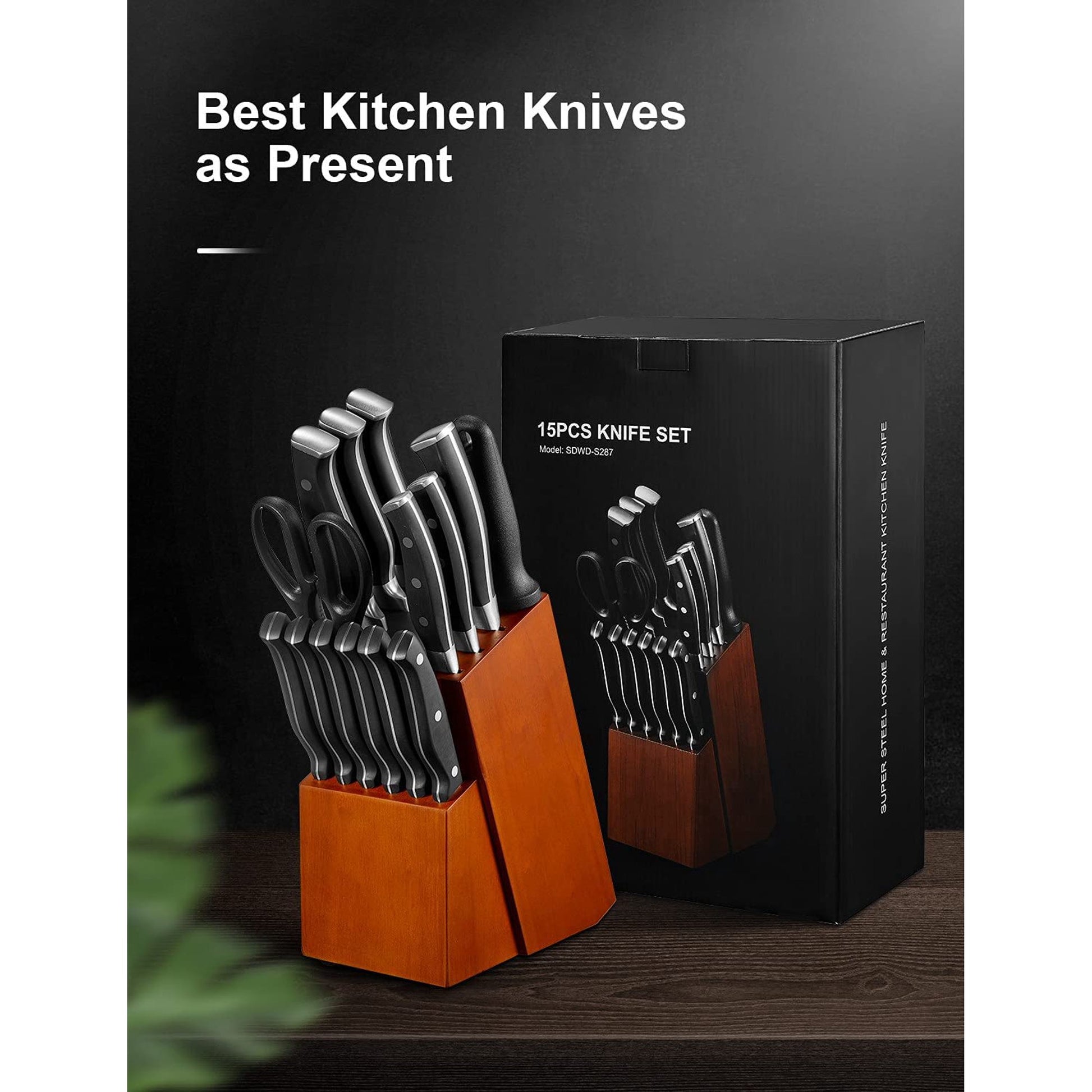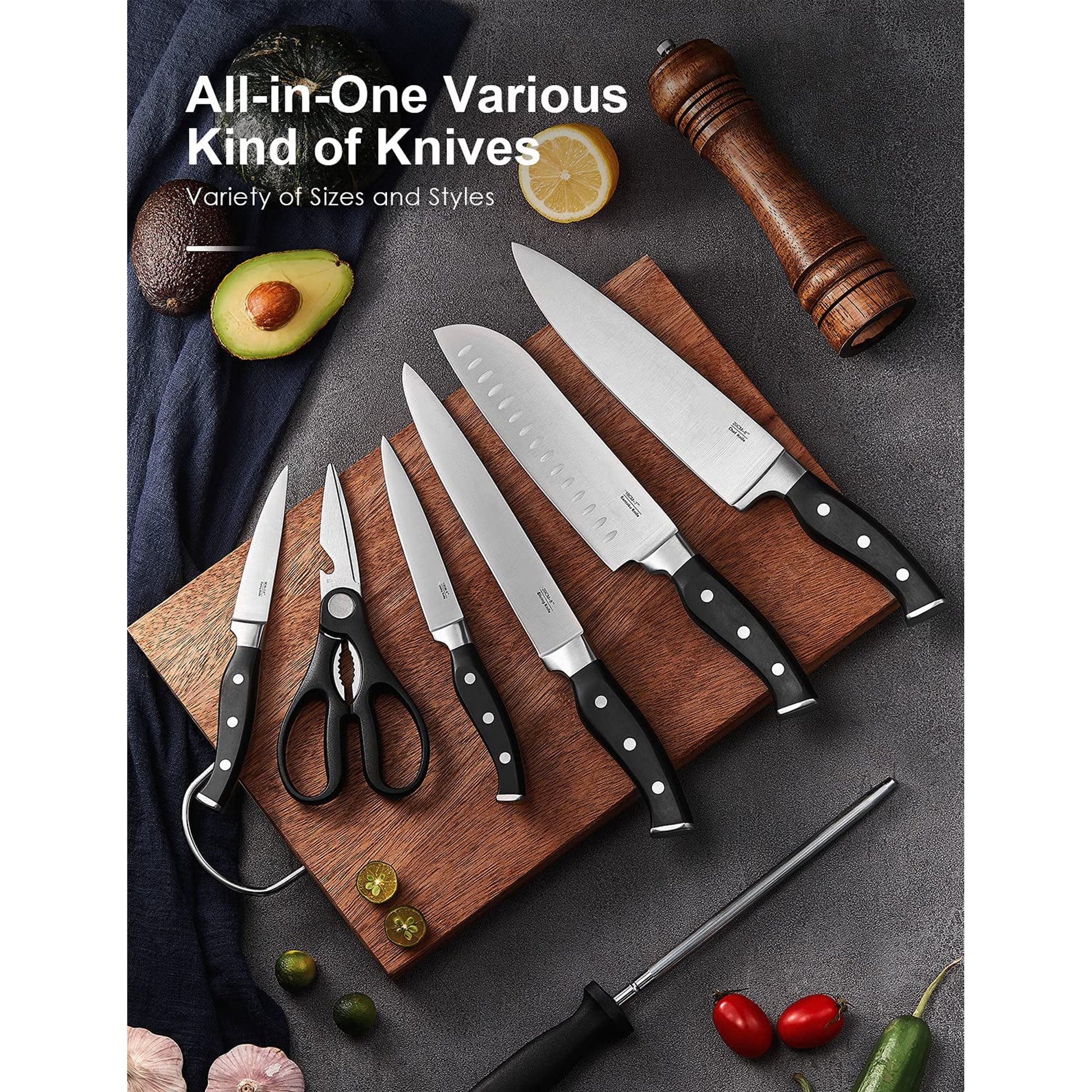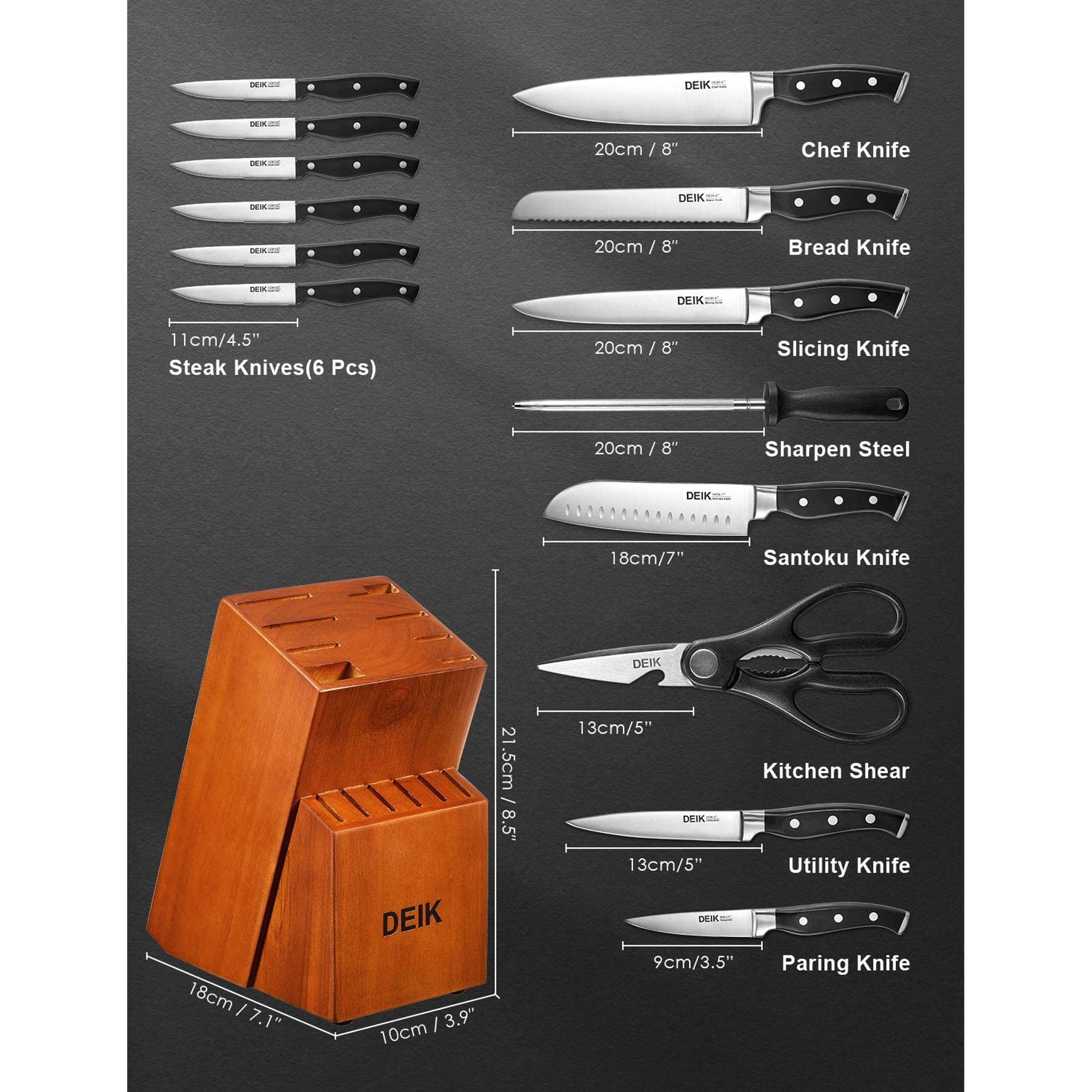 Including Chef Knife, Santoku Knife, Bread Knife, Slicing Knife, Utility Knife, 6 pieces of Steak Knives, Paring Knife, Sharpener and Kitchen Shears.